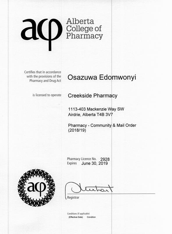 Creekside Pharmacy Pharmacist: Osazuwa Edomwonyi Pharmacy License no. 2928