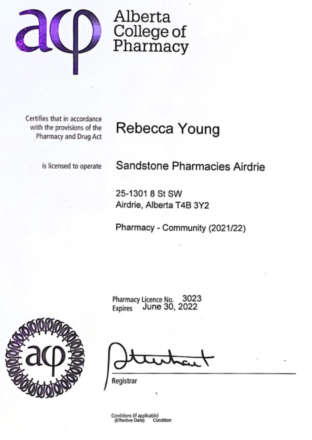 Rebecca Young Pharmacy Manager License No. 8148 Pharmacy License No. 3023 Proprietor Information: Apex Pharmacies Ltd. #2, 1329 – 45 Ave NE Calgary, AB T2E 2P3 Contact: Bruce Winston Email Us http://www.sandstonepharmacies.com/airdrie/contact-us/