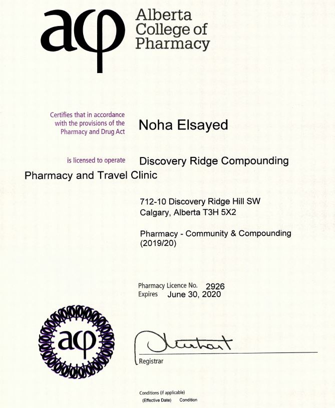 Pharmacy Manager: Noha Elsayed ; Practice Permit # 7494 Pharmacy License No. 2926