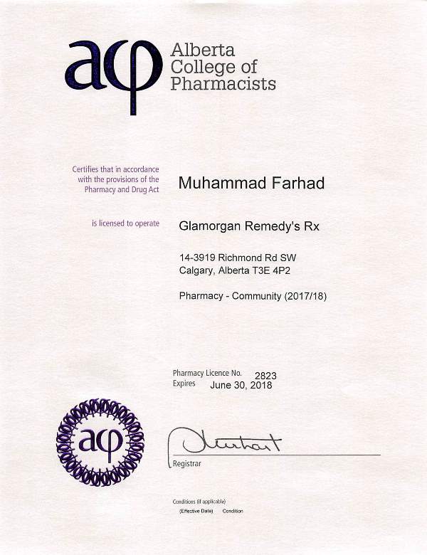 Pharmacist: Muhammad Farhad #9578 Pharmacy License no. 2823 Owner: Multidimention Inc. Representative: Muhammad Farhad address: #14 3919 Richmond Rd SW, Calgary Alberta
