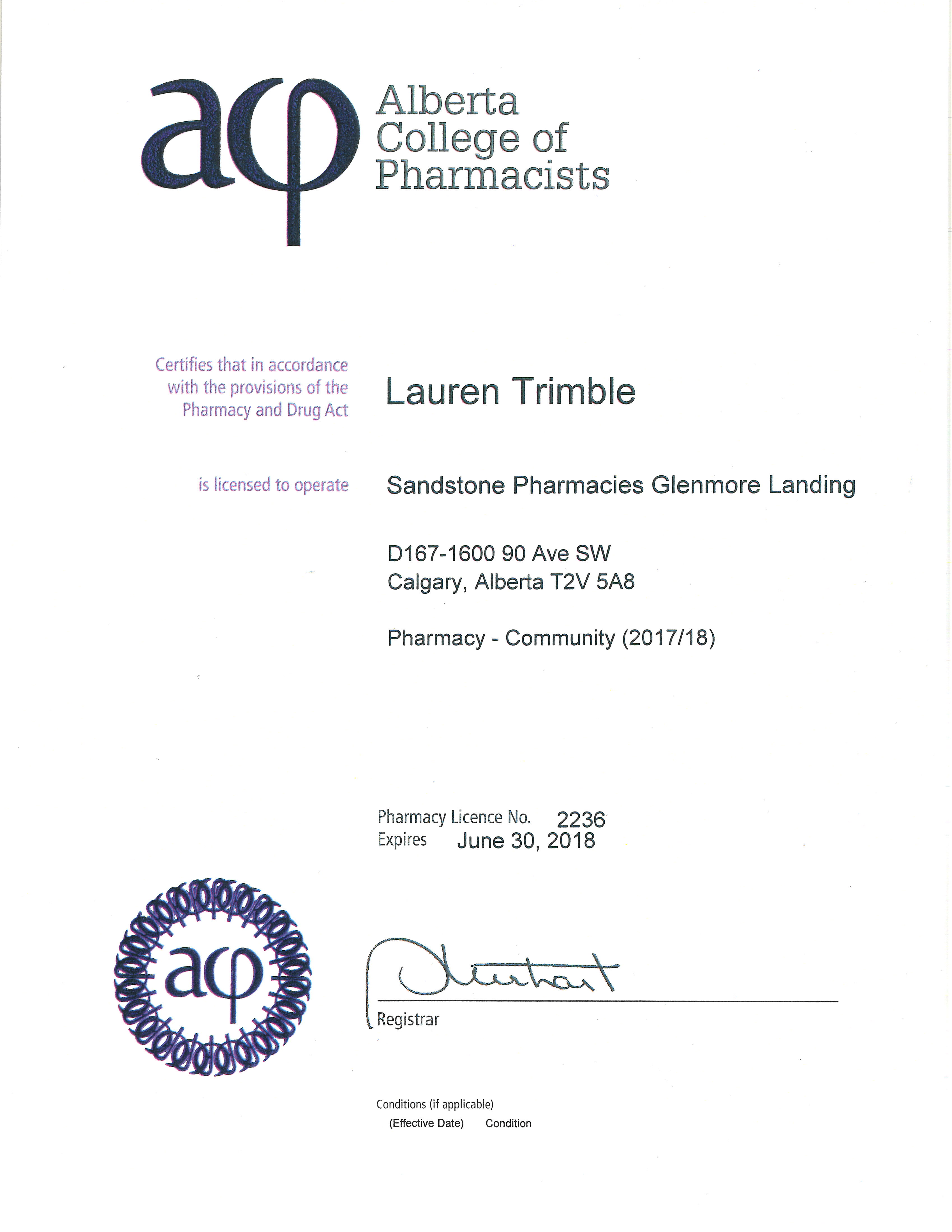 Lauren Trimble Pharmacy Manager, License #11352 Pharmacy License #2236 Proprietor Information: Apex Pharmacies Ltd. #2, 1329 – 45 Ave NE Calgary, AB T2E 2P3 Contact: Bruce Winston Email Us http://www.sandstonepharmacies.com/ glenmore-landing/contact-us/
