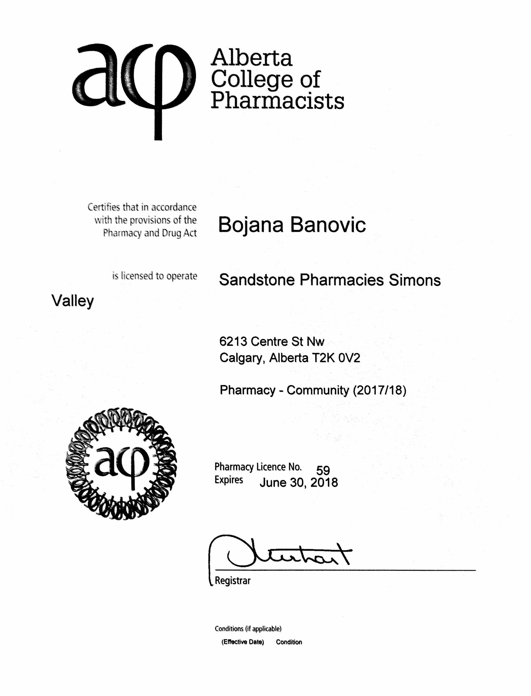 Bojana Banovic Pharmacy License #59 Proprietor Information: Apex Pharmacies Ltd. #2, 1329 – 45 Ave NE Calgary, AB T2E 2P3 Contact: Bruce Winston Email Us http://www.sandstonepharmacies.com/ simons-valley/contact-us/