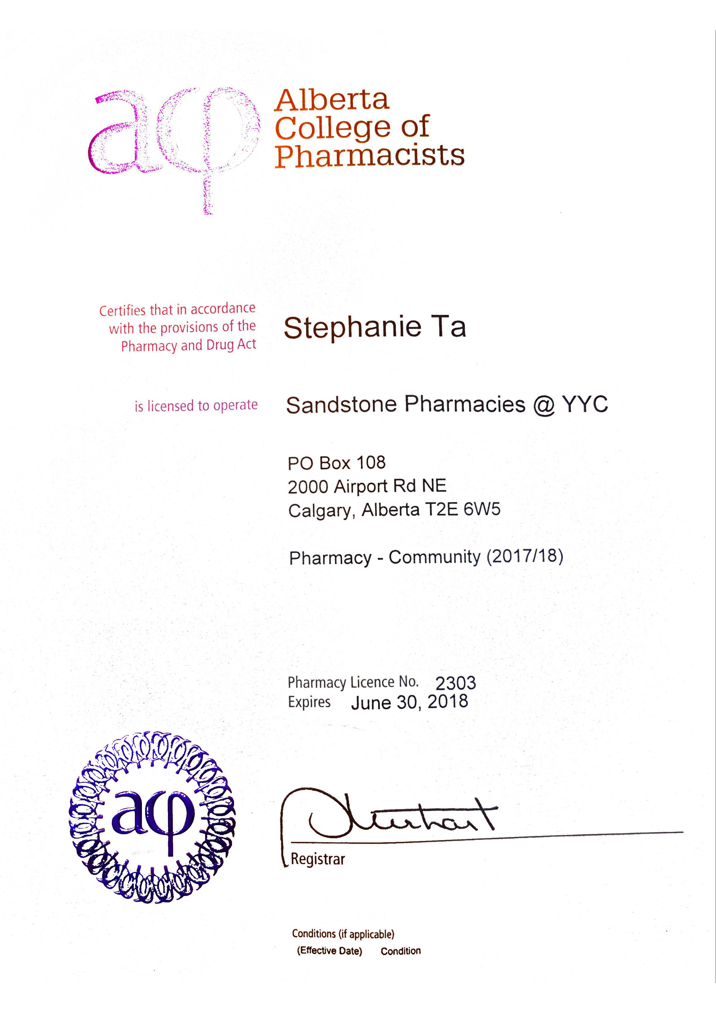 Stephanie Ta Pharmacy Manager, License #14449 Pharmacy License #2303 Proprietor Information: Apex Pharmacies Ltd. #2, 1329 – 45 Ave NE Calgary, AB T2E 2P3 Contact: Bruce Winston Email Us http://www.sandstonepharmacies.com/ airport/contact-us/