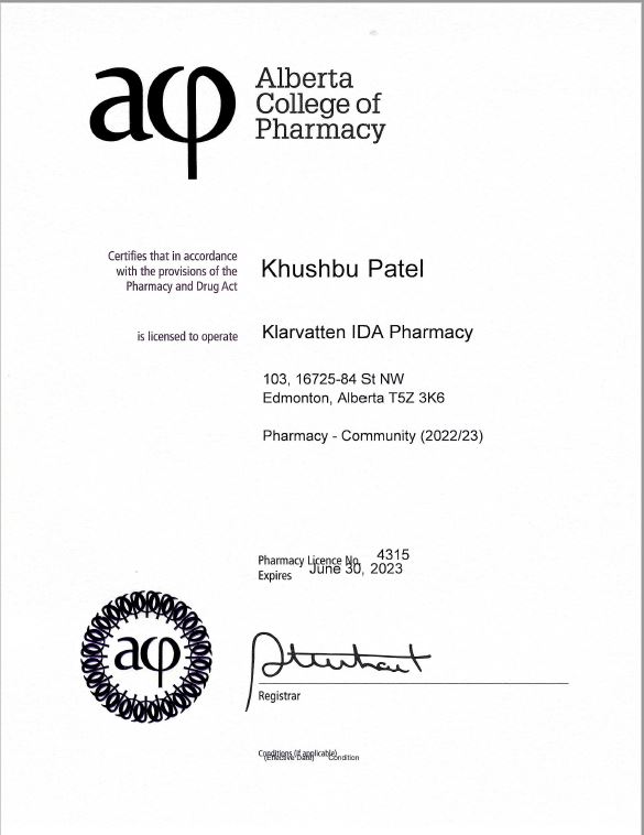 Khushbu Patel Pharmacy License No. 4315 Pharmacy - Community (2022/23)