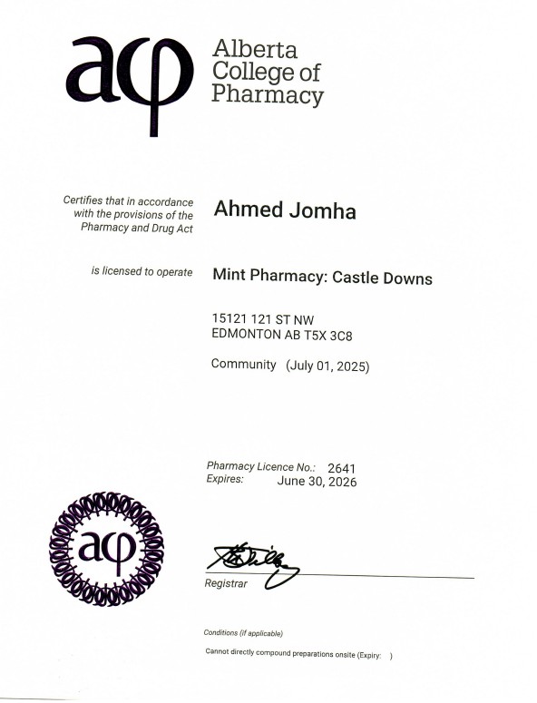 Ahmed Jomha Pharmacy License No.: 2641 Community (July 01, 2025) Expires: June 30, 2026