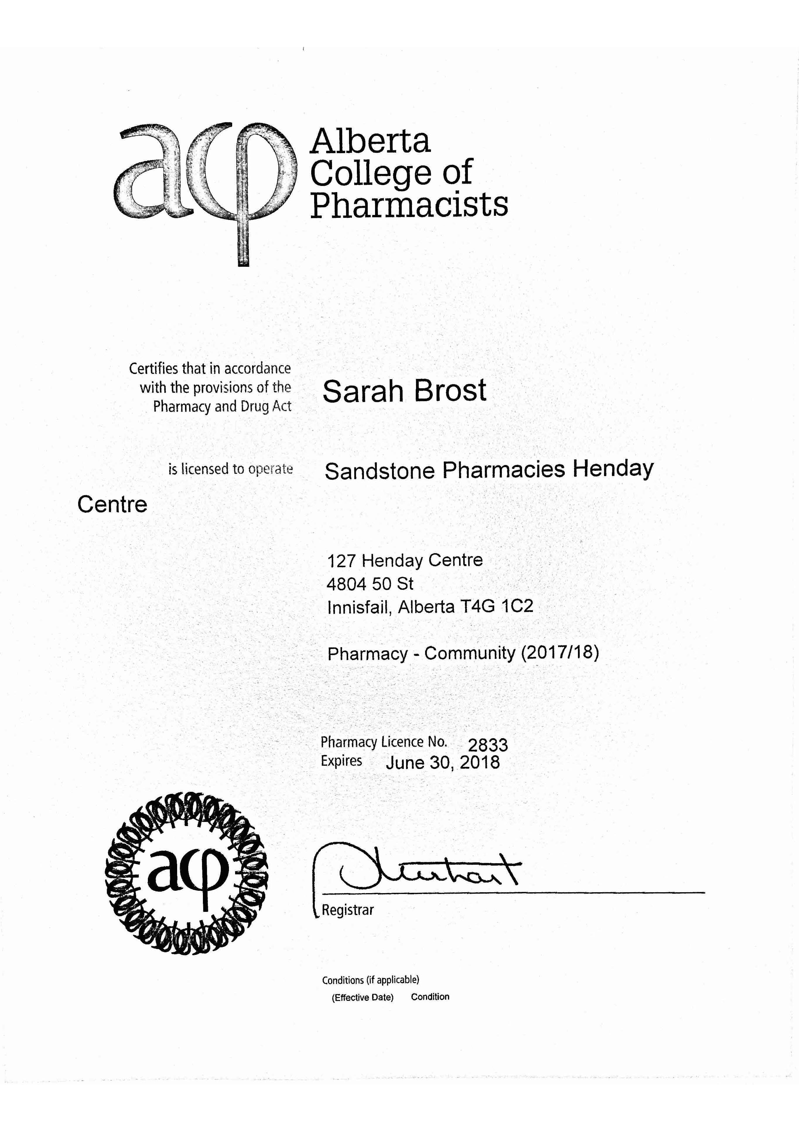 Sarah Brost Pharmacy Manager, License #10113 Pharmacy License #2833 Proprietor Information: Apex Pharmacies Ltd. #2, 1329 – 45 Ave NE Calgary, AB T2E 2P3 Contact: Bruce Winston Email Us http://www.sandstonepharmacies.com/ henday/contact-us/