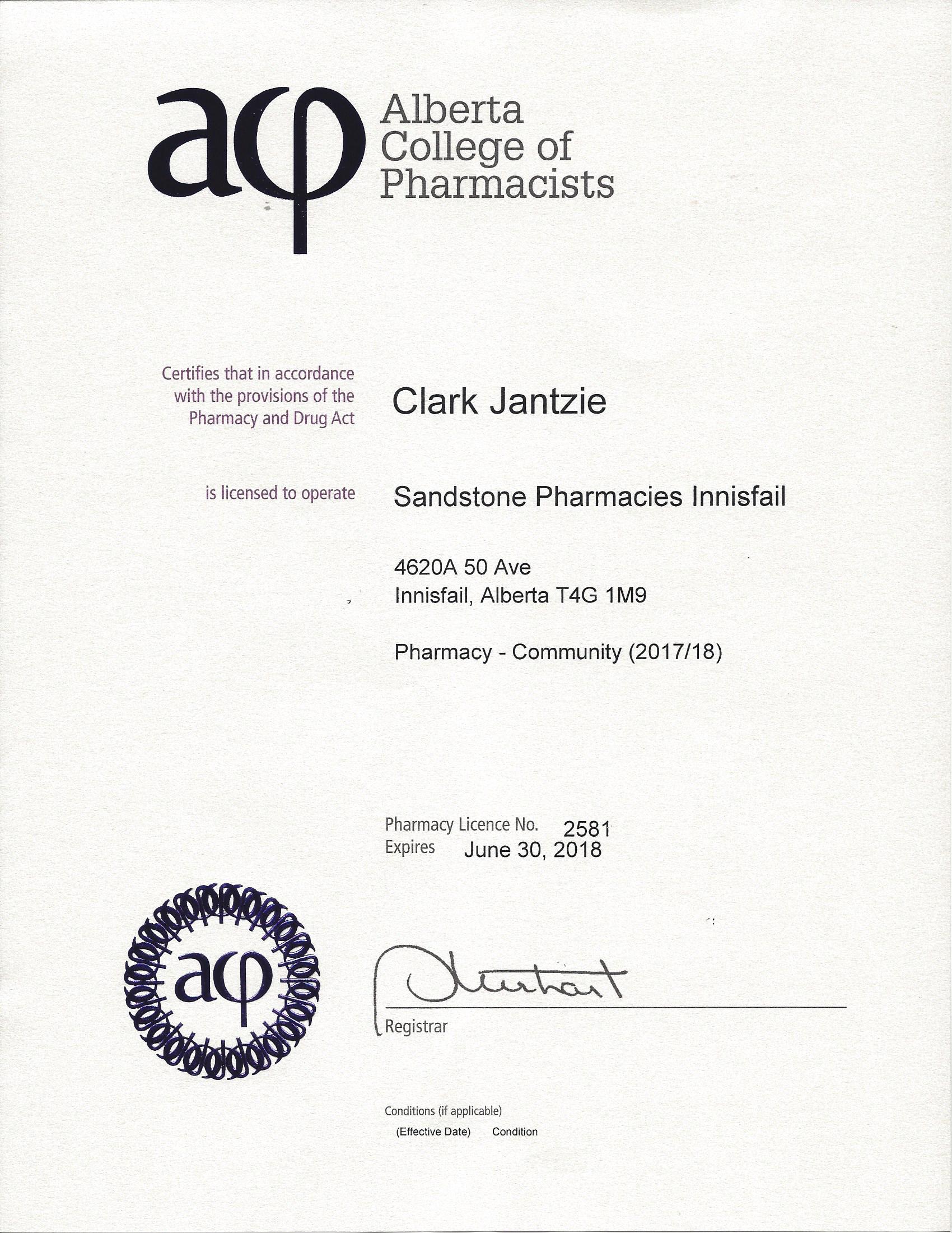 Clark Jantzie Pharmacy License No. 2581 Proprietor Information: Apex Pharmacies Ltd. #2, 1329 – 45 Ave NE Calgary, AB T2E 2P3 Contact: Bruce Winston Email Us http://www.sandstonepharmacies.com/ innisfail/contact-us/