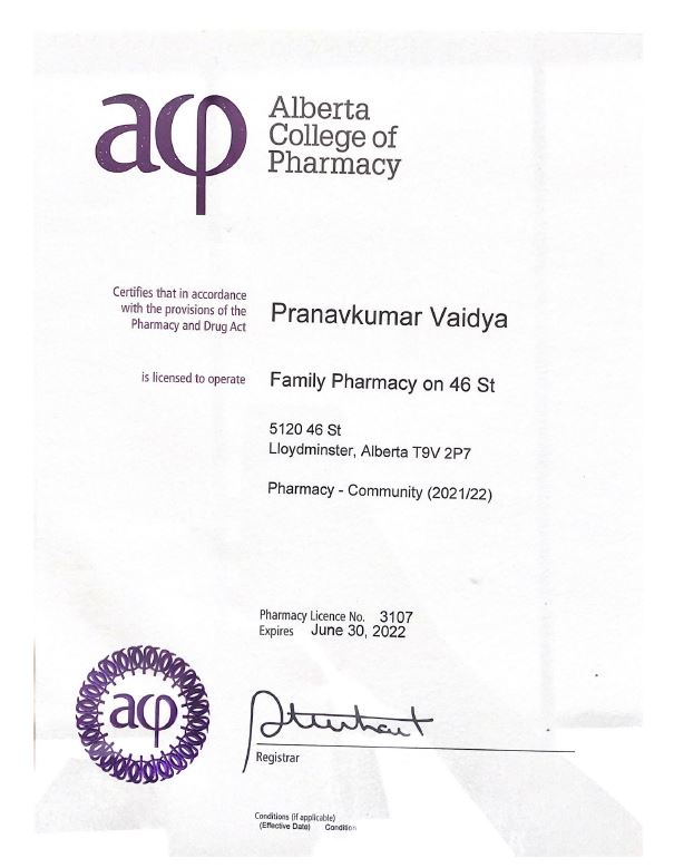 Contact: Pranavkumar Vaidya Pharmacy Manager's License no. 16260 Pharmacy - Community (2021/22) Pharmacy License No. 3107 2003pharmacy@rxdm.ca Proprietor: 1991136 AB Ltd 400-190 Attwell Dr. Etobicoke, ON M9W 6H8