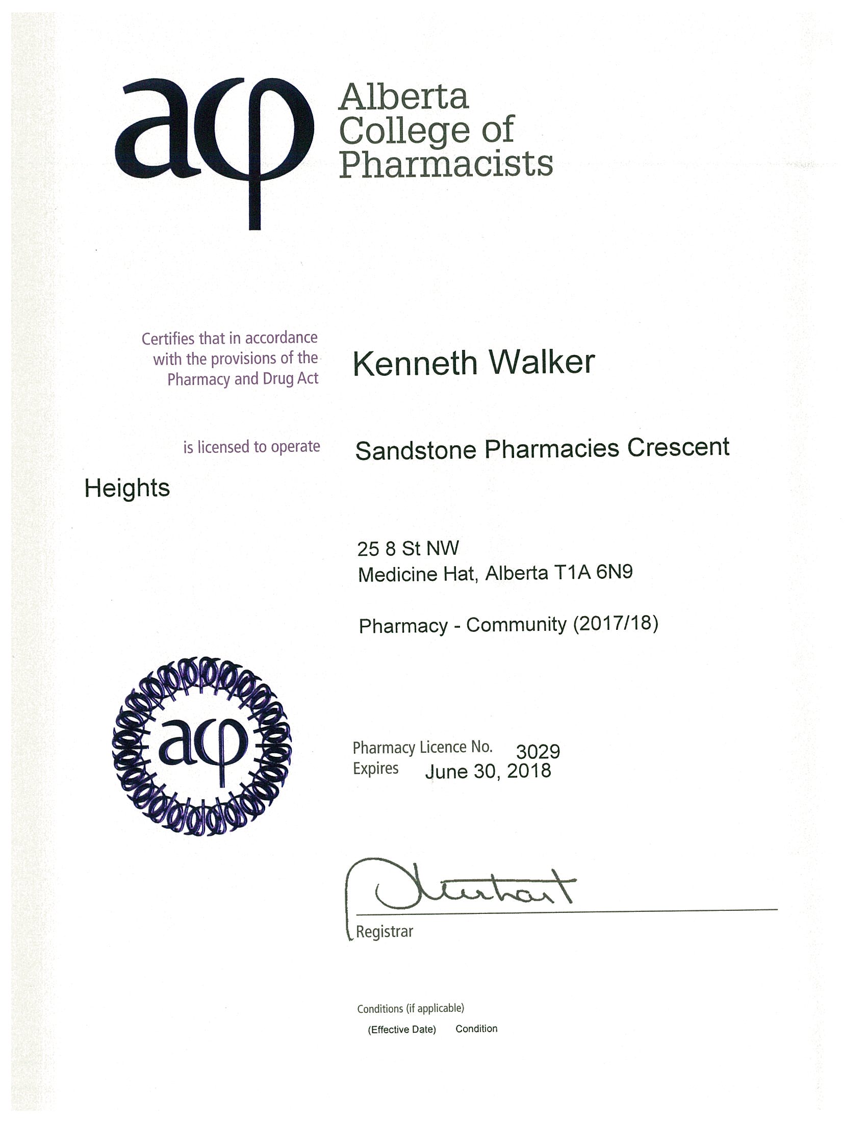 Kenneth Walker Pharmacy License #3029 Proprietor Information: Apex Pharmacies Ltd. #2, 1329 – 45 Ave NE Calgary, AB T2E 2P3 Contact: Bruce Winston Email Us http://www.sandstonepharmacies.com/medicine_hat/contact-us/