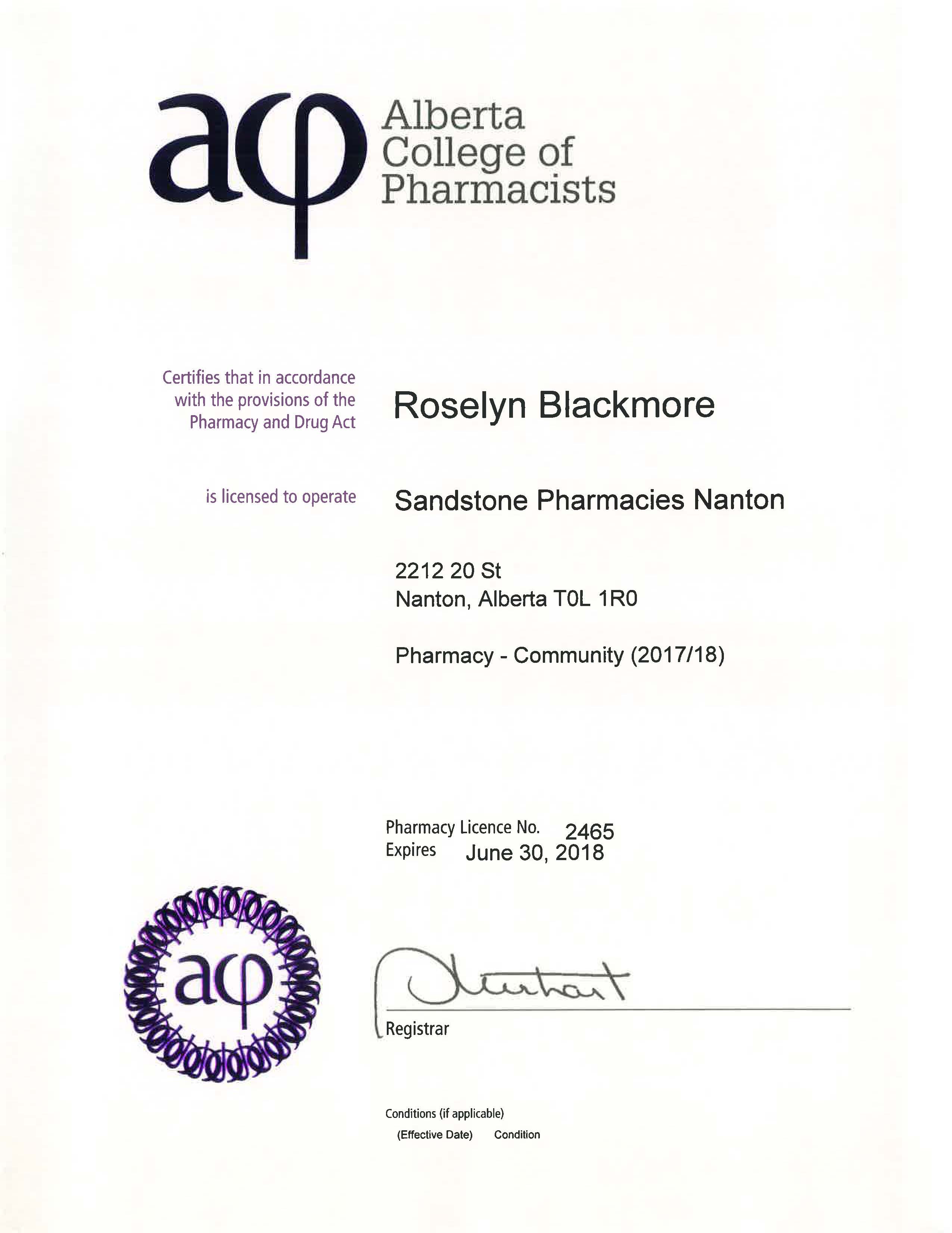 Roselyn Blackmore Pharmacy Manager, License #7520 Pharmacy License #2465 Proprietor Information: Apex Pharmacies Ltd. #2, 1329 – 45 Ave NE Calgary, AB T2E 2P3 Contact: Bruce Winston Email Us http://www.sandstonepharmacies.com/ nanton/contact-us/