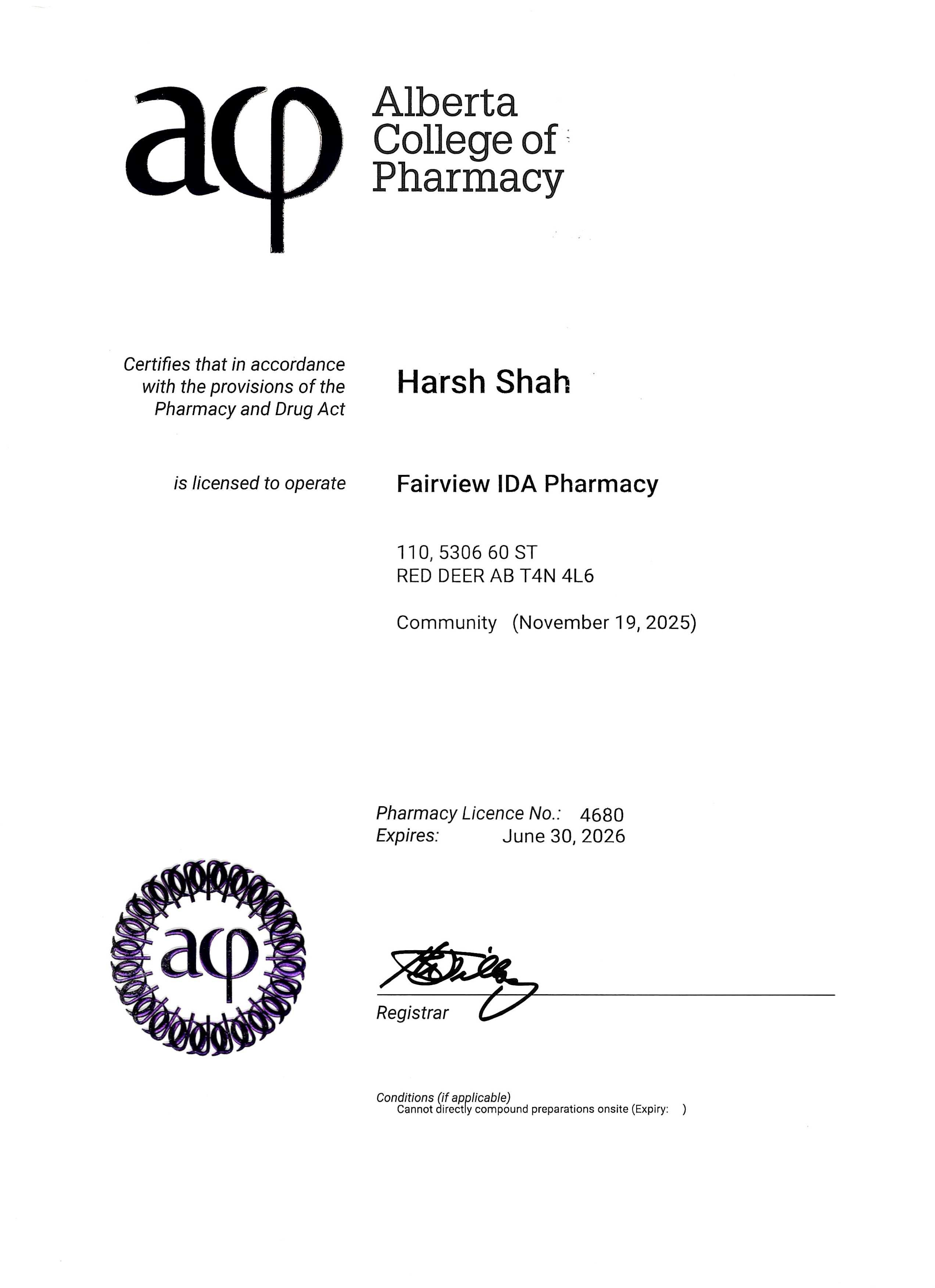 Licensee Pharmacist: Harsh Shah Practice permit number #19035 Pharmacy License No. 4680 Pharmacy - Community (2025/26)
