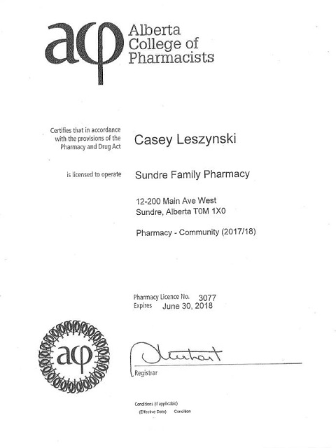 Proprietor: Sundre Family Pharmacy Ltd Representative: Casey Leszynski Pharmacy Manager: Casey Leszynski License #13128 Pharmacy License No. 3579